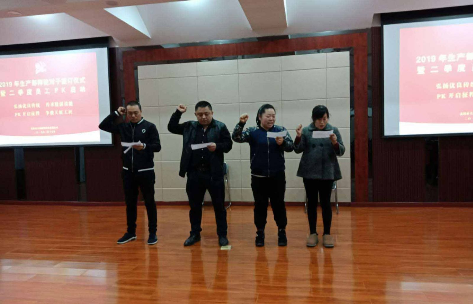 在活動現(xiàn)場,在公司總經(jīng)理陳志浩先生、營運副總馬少華先生、營銷副總高銀旺先生以及幾十名車間員工的見證下,共有10對師徒完成了拜師儀式和簽訂師徒對子協(xié)議,最后師徒們結(jié)對走上舞臺,作出莊嚴(yán)的承諾。