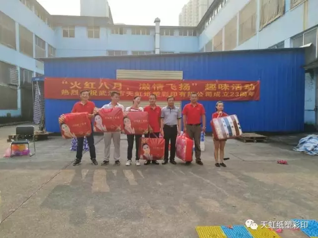 8月21日,在喜迎司慶23周年之際,武漢市天虹紙塑彩印有限公司組織舉辦了以“火紅八月,激情飛揚”為主題的趣味運動會,活動吸引了全公司6個部門36名選手參與,活動取得了圓滿成功。